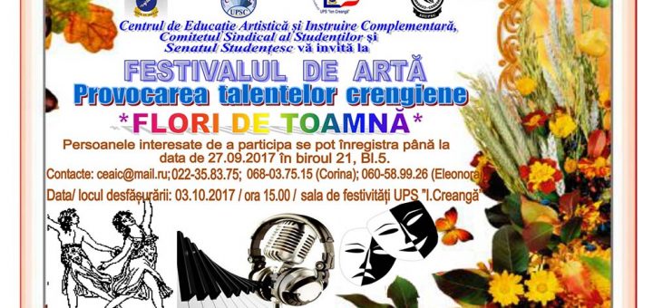 Provocarea talentelor crengiene *FLORI DE TOAMNĂ* Persoanele interesate de a participa se pot înregistra până la data de 27.09.2017 în biroul 21, Bl. 5.