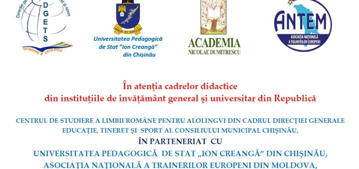 În atenţia cadrelor didactice din instituţiile de învățământ general şi universitar din Republică CENTRUL DE STUDIERE A LIMBII ROMÂNE PENTRU ALOLINGVI DIN CADRUL DIRECŢIEI GENERALE EDUCAŢIE, TINERET ŞI SPORT AL CONSILIULUI MUNICIPAL CHIŞINĂU, ÎN PARTENERIAT CU UNIVERSITATEA PEDAGOGICĂ DE STAT „ION CREANGĂ” DIN CHIȘINĂU, ASOCIAȚIA NAȚIONALĂ A TRAINERILOR...