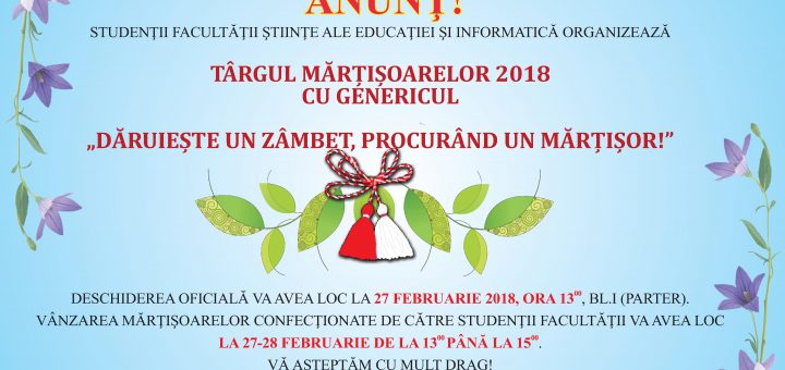 Studenții facultății științe ale educației și informatică organizează târgul mărțișoarelor 2018 cu genericul „dăruiește un zâmbet, procurând un mărțișor!” deschiderea oficială va avea loc la 27 februarie 2018, ora 1300, bl. I (parter). Vânzarea mărțișoarelor confecționate de către studenții facultății va avea loc la 27-28 februarie de la 1300 până...