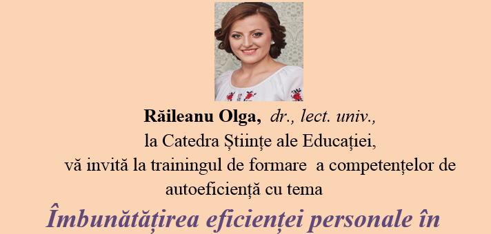 Joi, 6 decembrie, 2018 ora 940 , bl. III, sala 29                                             Răileanu Olga,  dr., lect. univ., la Catedra Științe ale Educației,        vă invită la trainingul de formare  a competențelor de autoeficiență cu tema Îmbunătățirea eficienței personale în contextul edificării și a menținerii familiei ca Proiect Existențial, susținută...