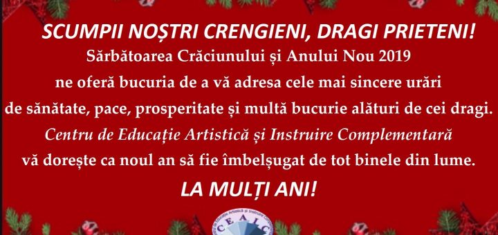 Sărbătoarea Crăciunului și Anului Nou 2019 ne oferă bucuria de a vă adresa cele mai sincere urări de sănătate, pace, prosperitate și multă bucurie alături de cei dragi. Centrul de Educație Artistică și Instruire Complementară vă dorește ca noul an să vă fie îmbelșugat de tot binele din lume. LA...