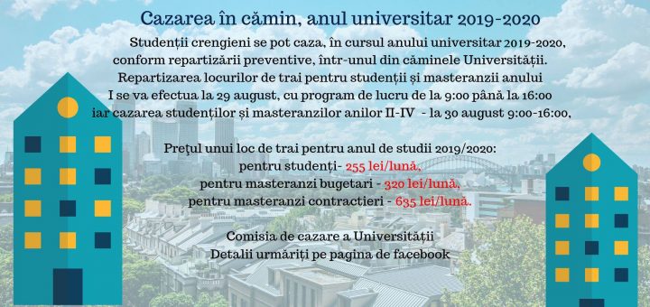 Cazarea în cămin, anul universitar 2019-2020 Studenții crengieni se pot caza, în cursul anului universitar 2019-2020, conform repartizării preventive, într-unul din căminele Universității. Repartizarea locurilor de trai se va efectua conform următoarelor categorii: pentru studenții și masteranzii anului I: 29 august, de la 9:00 până la 16:00; pentru studenții și masteranzii...