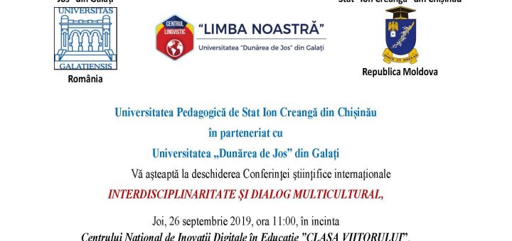 Astăzi, 26 septembrie 2019, în incinta Centrului Național de Inovații Digitale în Educație ”CLASA VIITORULUI”, și-a deschis lucrările Conferința științifică internațională INTERDISCIPLINARITATE ŞI DIALOG MULTICULTURAL, organizată de Universitatea Pedagogică de Stat Ion Creangă din Chişinău, Catedra Limbă și Comunicare în parteneriat cu Facultatea Transfrontalieră de la Universitatea „Dunărea de Jos”...