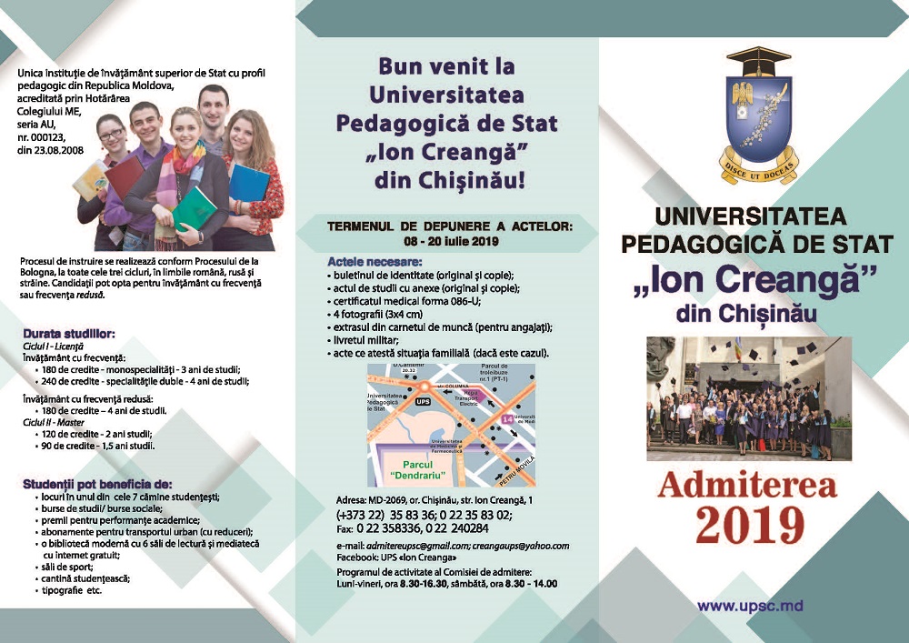 În conformitate cu Regulamentul de organizare a admiterii la Universitatea Pedagogică de Stat „Ion Creangă‟ în anul de studii 2019-2020 și decizia Comisiei de Admitere din 30.08.2019