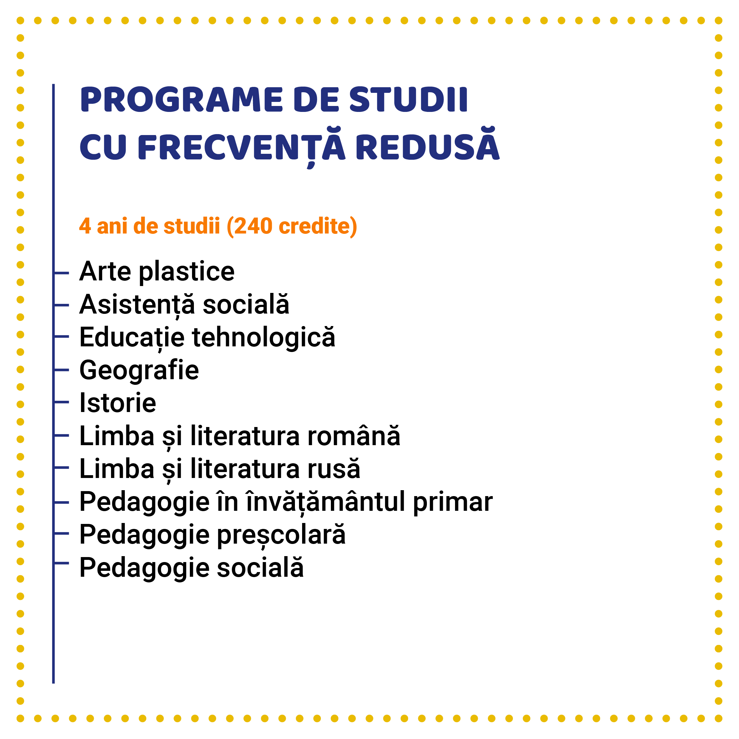 Metodologia de admitere Regulamentul de organizare a admiterii Acte pentru înscriere Taxe de studii Termene de organizare Plan înmatriculare cu frecvență Plan înmatriculare cu frecvență redusă Arte Plastice și Design +373 68687743 arte_design@upsc.md Filologie și Istorie +373 68681857 filologie_istorie@upsc.md Limbi și Literaturi Străine +373 68684353 limbi_straine@upsc.md Psihologie și Psihopedagogie Specială +373 68659666 psihologie_pps@upsc.md Științe ale Educației și Informatică +373 68684214 educatie_informatica@upsc.md Centrul de Formare Continuă +373 68686385 formare.continua@upsc.md