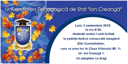 Vineri, 1 septembrie 2017 de Ziua Cunoștințelor Centrul de Ghidare și Consiliere în Carieră anunță demararea Zilei Matricolei pentru studenții anului I la toate facultățile UPS „Ion Creangă” din Chișinău conform orarului: