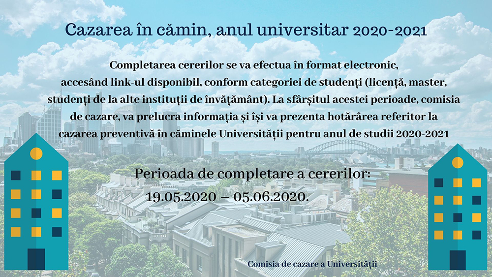 Stimați studenți, se anunță perioada colectării cererilor de solicitare a unui loc de trai în căminele Universității, pentru anul de studii 2020-2021